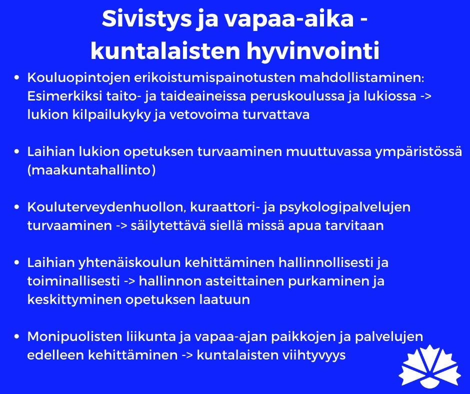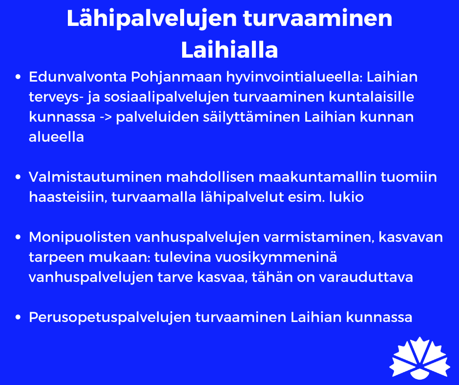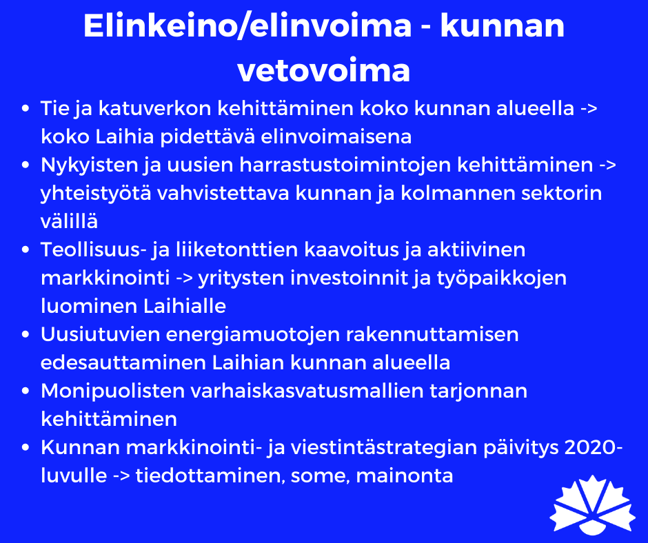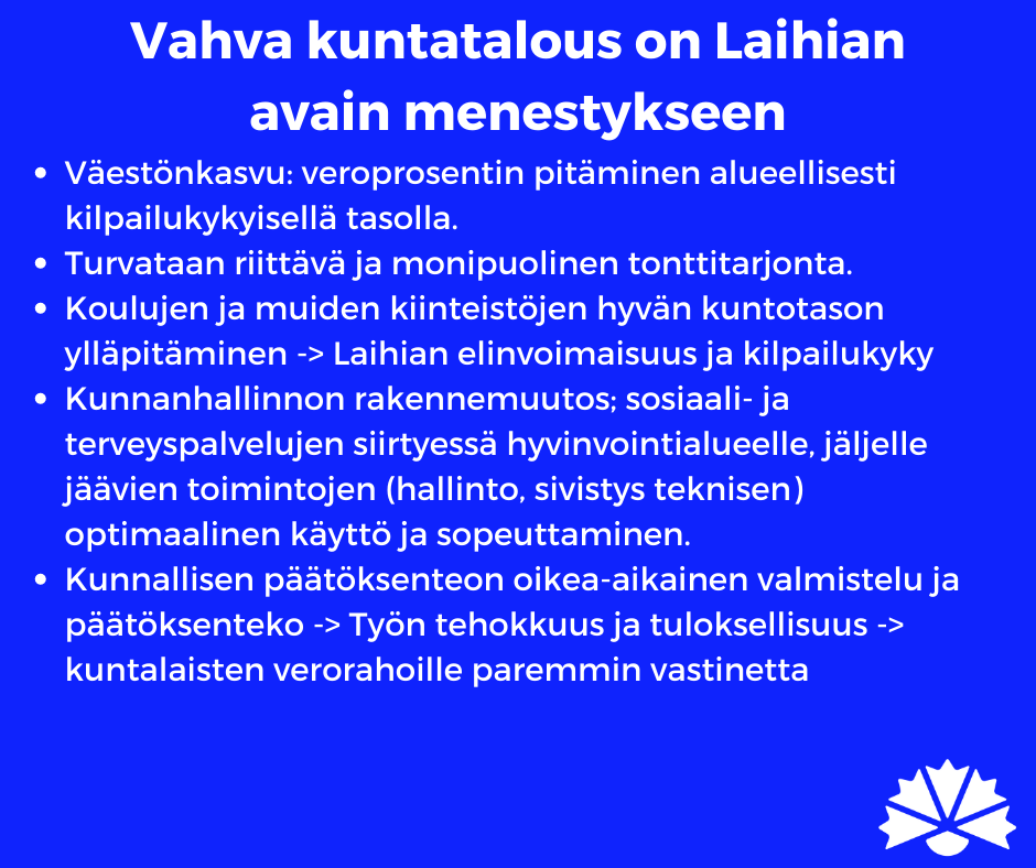 Kokoomuksen tavoitteena on palauttaa Laihia takaisin kasvun ja menestyksen tielle. Tulevalla valtuustokaudella ratkaistaan Suomen kuntien kohtalo ja sen mukana myös Laihian itsenäisyys. Me sanomme EI kuntien päätäntävallan vähenemiselle ja ylimääräiselle hallinnolle, jota nykyhallituksen sote-uudistus on luomassa. Kokoomus haluaa Laihian pysyvän itsenäisenä kuntana, mutta se vaatii kovia päätöksiä. On aika palauttaa Laihia takaisin kasvun ja menestyksen tielle.